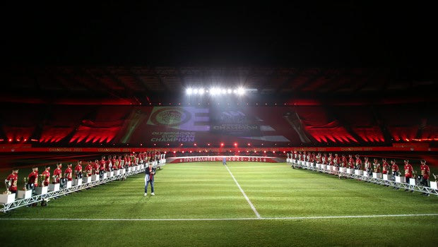 Τα παιδιά της Ακαδημίας του Ολυμπιακού έκαναν την είσοδό τους στον αγωνιστικό χώρο για τη φιέστα των ερυθρόλευκων κρατώντας στα χέρια τους τα 45 προηγούμενα πρωταθλήματα.