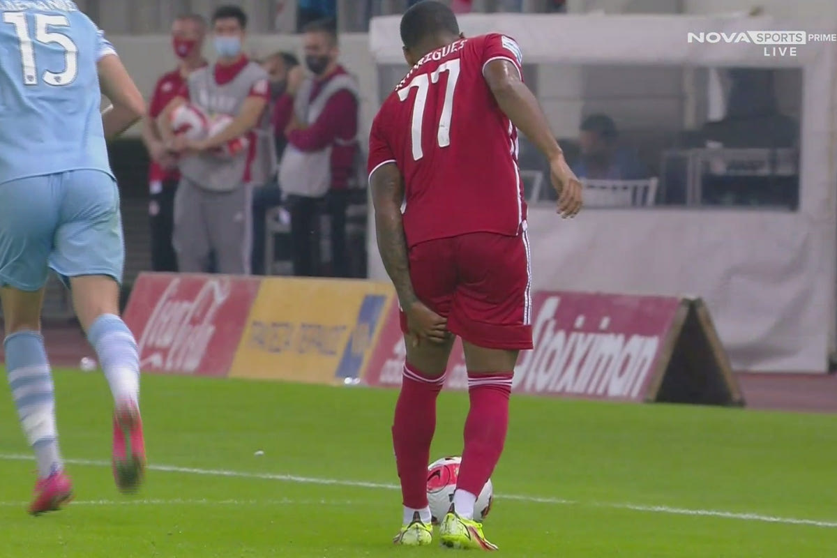 Ο παίκτης των ερυθρόλευκων, αφού ένιωσε την ενόχληση έπεσε στο έδαφος, εμφανώς απογοητευμένος με την εξέλιξη, ενώ στη θέση του πέρασε ο Χένρι Ονιεκούρου.