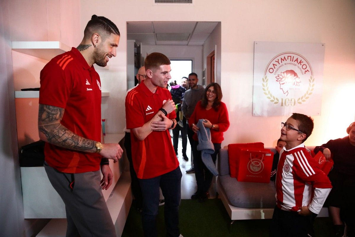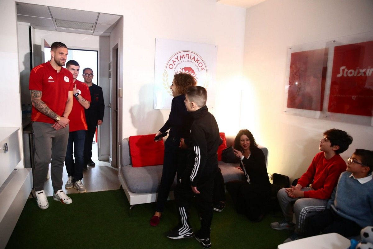 Πριν την έναρξη της αναμέτρησης οι ποδοσφαιριστές της ομάδας Αλέξανδρος Πασχαλάκης, Απόστολος Αποστολόπουλος, βρέθηκαν σε σουίτα του «Γ. Καραϊσκάκης», η οποία ήταν ειδικά διαμορφωμένη για να φιλοξενήσει τα παιδιά, και μοίρασαν χαμόγελα και ερυθρόλευκα δώρα.