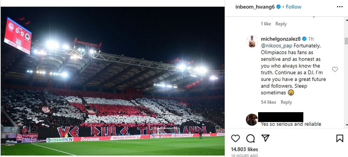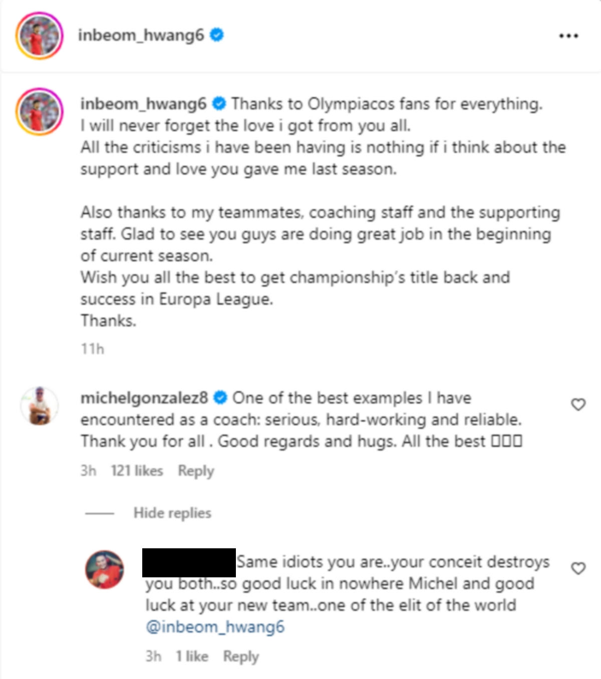 Κάτω από το ποστ του Νοτιοκορεάτη σχολίασε ο πρώην προπονητής του Ολυμπιακού, Μίτσελ: “Ένα από τα καλύτερα παραδείγματα που έχω συναντήσει ως προπονητής: σοβαρός σκληρός – εργατικός και αξιόπιστος. Σε ευχαριστώ για όλα. Φιλιά και αγκαλιές. Εύχομαι τα καλύτερα”