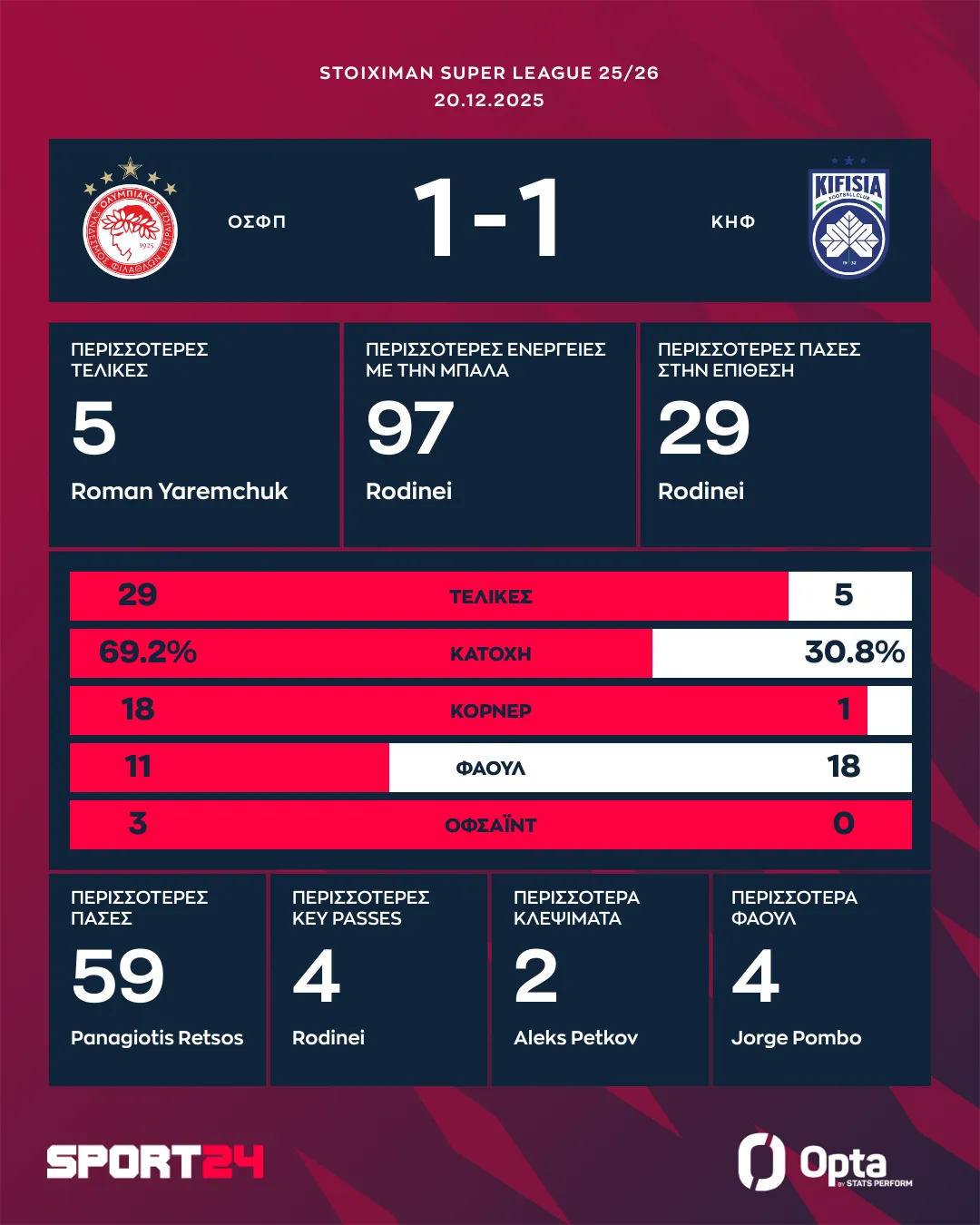 Ο Ολυμπιακός και η Κηφισιά ήρθαν ισόπαλοι 1-1 στο Γεώργιος Καραϊσκάκης, με τους ερυθρόλευκους να αποχαιρετούν με γκέλα το 2025 και την πρώτη θέση να κινδυνεύει. Μεγάλο αποτέλεσμα οι φιλοξενούμενοι στο Last Dance του Τεττέη.