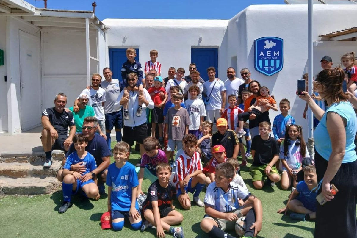 Οι παίκτες του Ολυμπιακού, Μπάμπης Κωστούλας και Αντώνης Παπακανέλλος επισκέφτηκαν την Αθλητική Ένωση Μυκόνου στο πλαίσιο του φιλικού αγώνα των μπαμπάδων των τμημάτων Κ8 και Κ10.