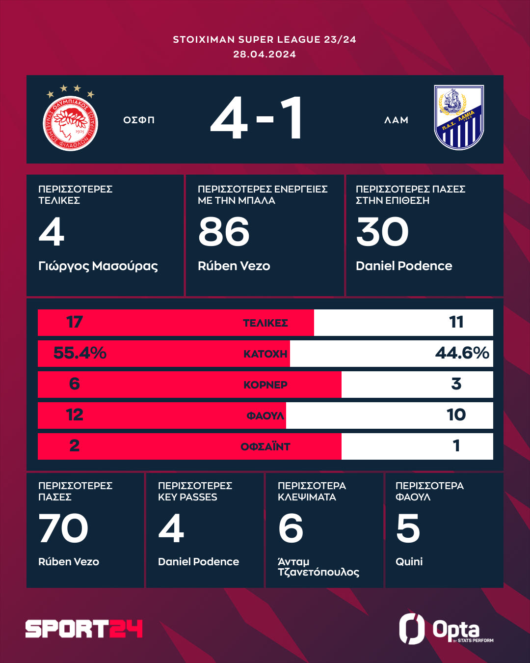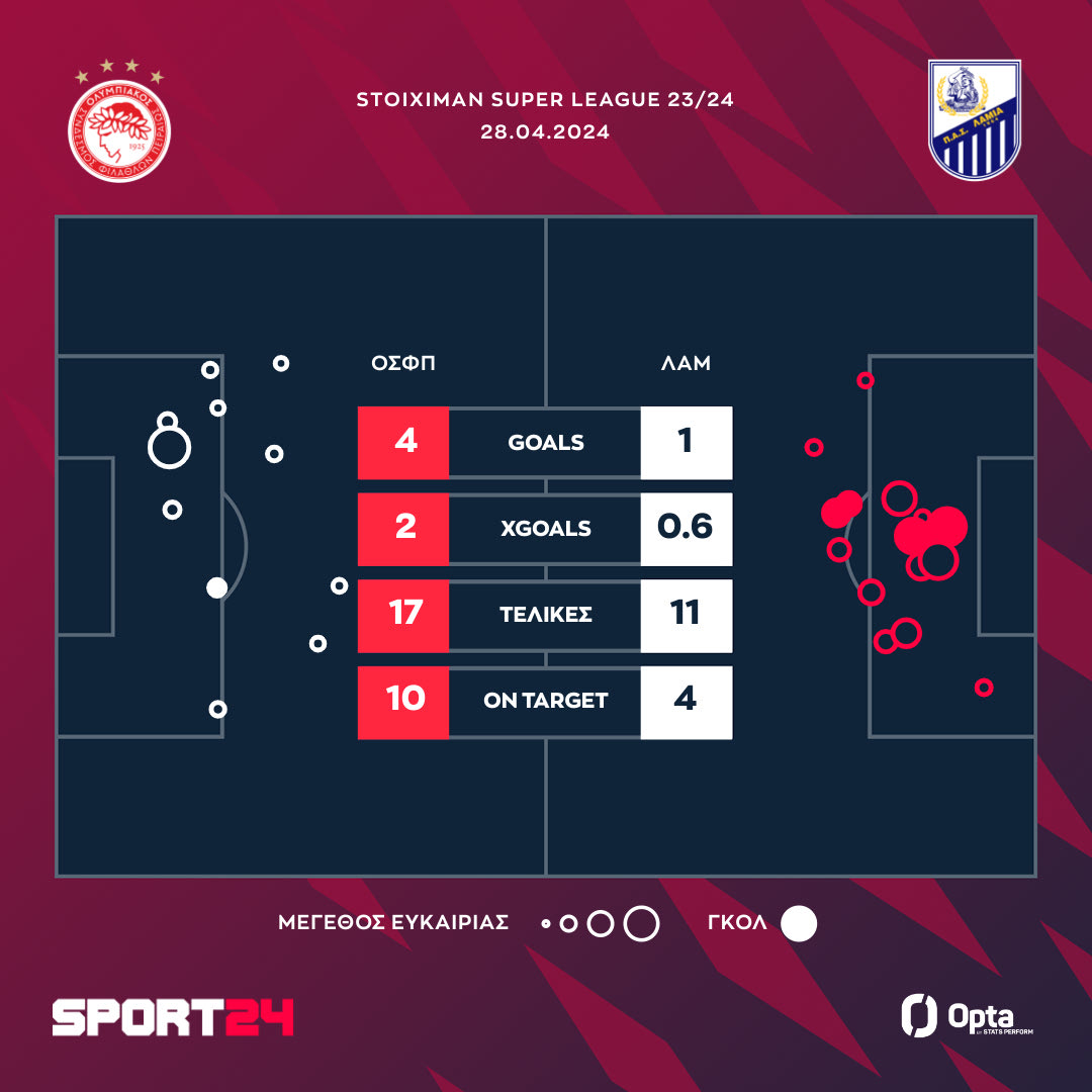 Ο Ολυμπιακός έκανε την δουλειά το απόγευμα της Κυριακής (28/4). Οι ερυθρόλευκοι επικράτησαν 4-1 της Λαμίας για την 8η αγωνιστική των playoffs της Stoiximan Super League και επέστρεψαν στις νίκες, μετά την προ ημερών ισοπαλία με τον Άρη.