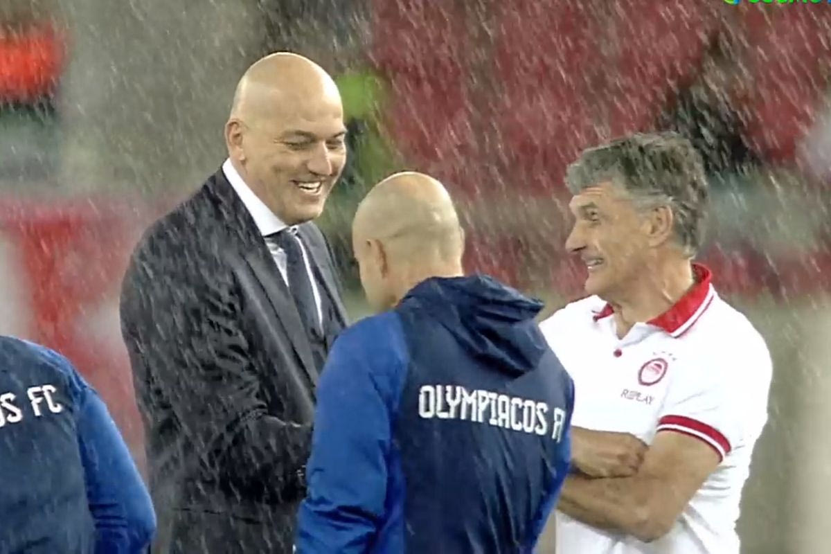 Λίγη ώρα πριν από το παιχνίδι οι Μεντιλίμπαρ, Κοβάσεβιτς και οι συνεργάτες τους βγήκαν στον αγωνιστικό χώρο για την καθιερωμένη βόλτα. Είχαν σταθεί και συζητούσαν, χωρίς ωστόσο να υπολογίζουν τα μπεκ του γηπέδου, τα οποία τους έβρεξαν.