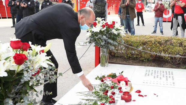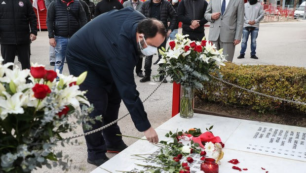 Ο Βαγγέλης Μαρινάκης, ο Παναγιώτης Αγγελόπουλος και ο Μιχάλης Κουντούρης έκαναν κατάθεση στεφάνων στο μνημείο για τα θύματα της Θύρας 7, έξω από το "Γεώργιος Καραϊσκάκης".