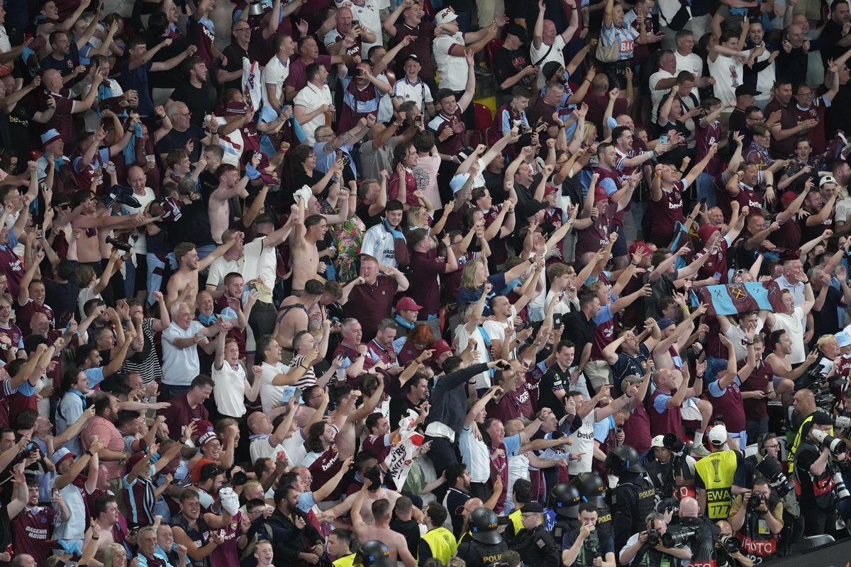 West Ham fans celebrate after the Europa Conference League final soccer match between Fiorentina and West Ham at the Eden Arena in Prague, Wednesday, June 7, 2023. (AP Photo/Darko Vojinovic) AP