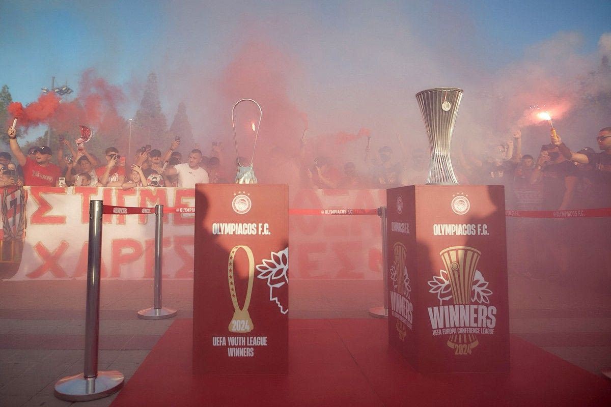 Ολυμπιακός: Με πανό “στιγμές της δόξας σου, χαρές δικές μας” υποδέχτηκαν στην Τρίπολη τα ευρωπαϊκά τρόπαια
