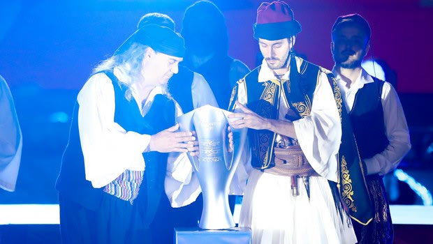 Η φιέστα του Ολυμπιακού συνεχίστηκε με την είσοδο του 46ου τίτλου της ιστορίας των ερυθρόλευκων. Προς τιμήν των 200 χρόνων από τη συμπλήρωση της ελληνικής επανάστασης, την κούπα κουβάλησαν στον αγωνιστικό χώρο του Καραϊσκάκης άνδρες με παραδοσιακές φορεσιές από κάθε πλευρά της Ελλάδας.