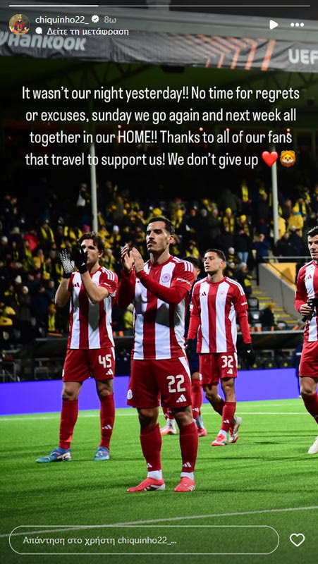 Ο Τσικίνιο από τη μεριά του, σε ανάρτησή του στους λογαριασμούς του στα social media ανέφερε: “Δεν ήταν η βραδιά μας. Δεν υπάρχει χρόνος για να μετανιώσουμε ή για συγνώμες, την Κυριακή και την επόμενη εβδομάδα όλοι μαζί στο γήπεδό μας. Ευχαριστούμε για την υποστήριξη. Δεν τα παρατάμε“.