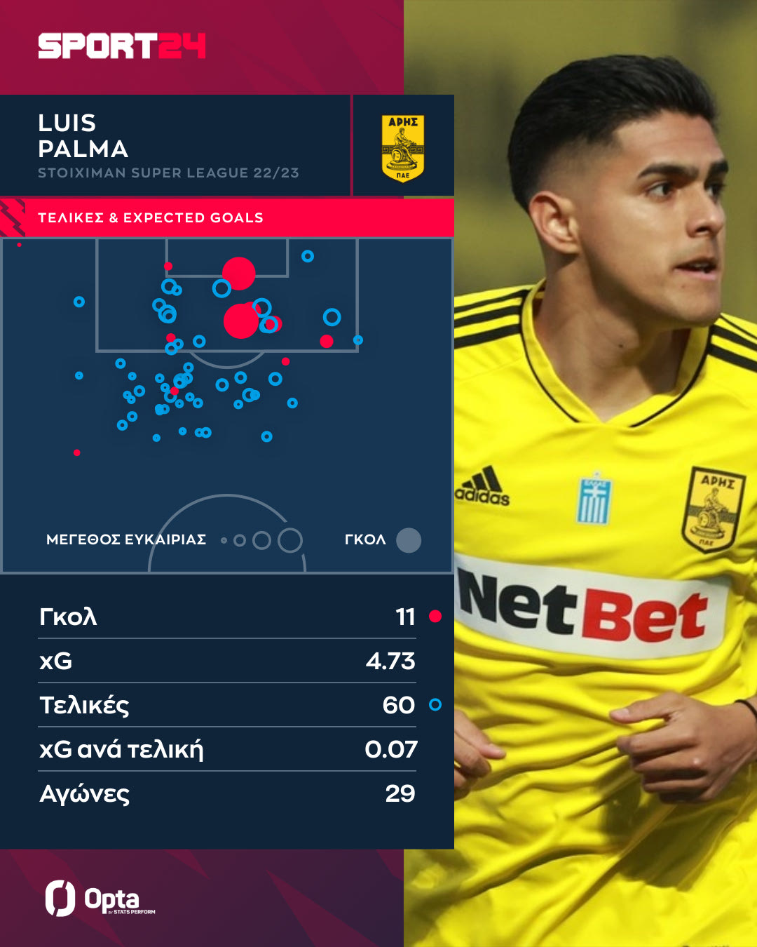 Αναμφίβολα, η σεζόν που έφερε τον Λουίς Πάλμα στο επίκεντρο των συζητήσεων ήταν το 2022-23. Τότε ο αλέγρος κυνηγός σημείωσε 11 γκολ στη Stoiximan Super League, πίσω μόνο από τους Σιντρίκ Μπακαμπού, Λιβάι Γκαρσία και Νίκο Καρέλη. Στο γράφημα της Opta Stats / Perform μπορείτε να δείτε όλα τα γκολ και τις τελικές του 25χρονου εκείνη τη σεζόν.