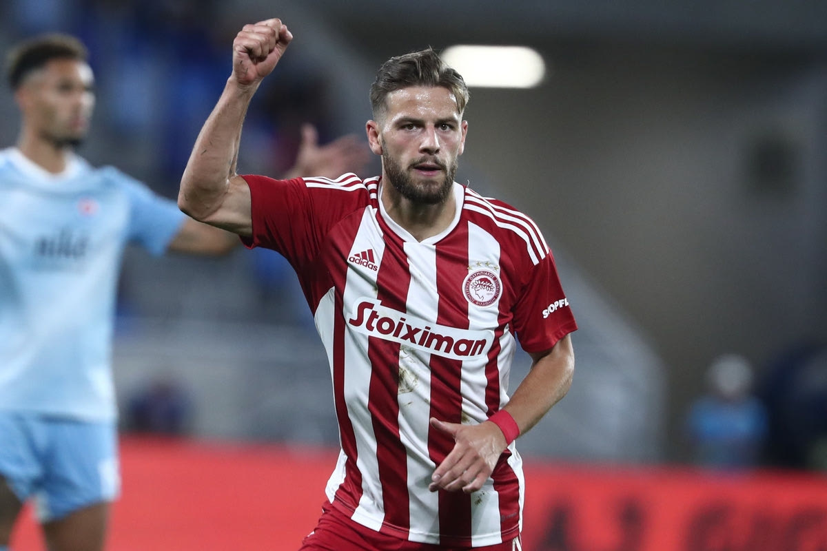 Ο Ζινκερνάγκελ πανηγυρίζει γκολ με τη φανέλα του Ολυμπιακού κόντρα στην Σλόβαν | 11 Αυγούστου 2022