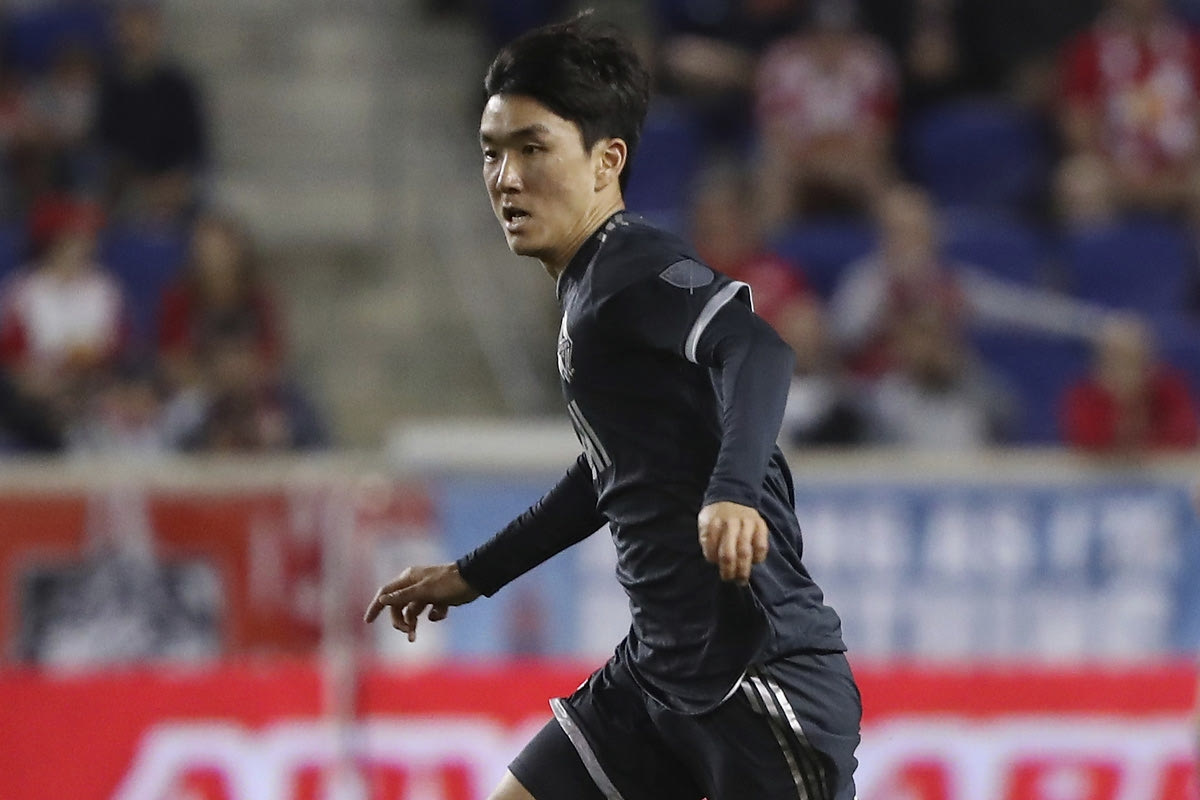 Vancouver Whitecaps midfielder In-Beom Hwang, right, moves the ball up the pitch during the second half of an MLS soccer match against the New York Red Bulls, Wednesday, May 22, 2019, in Harrison, N.J. The match ended in a 2-2 draw. (AP Photo/Steve Luciano) @ 2019 Steve Luciano / Associated Press