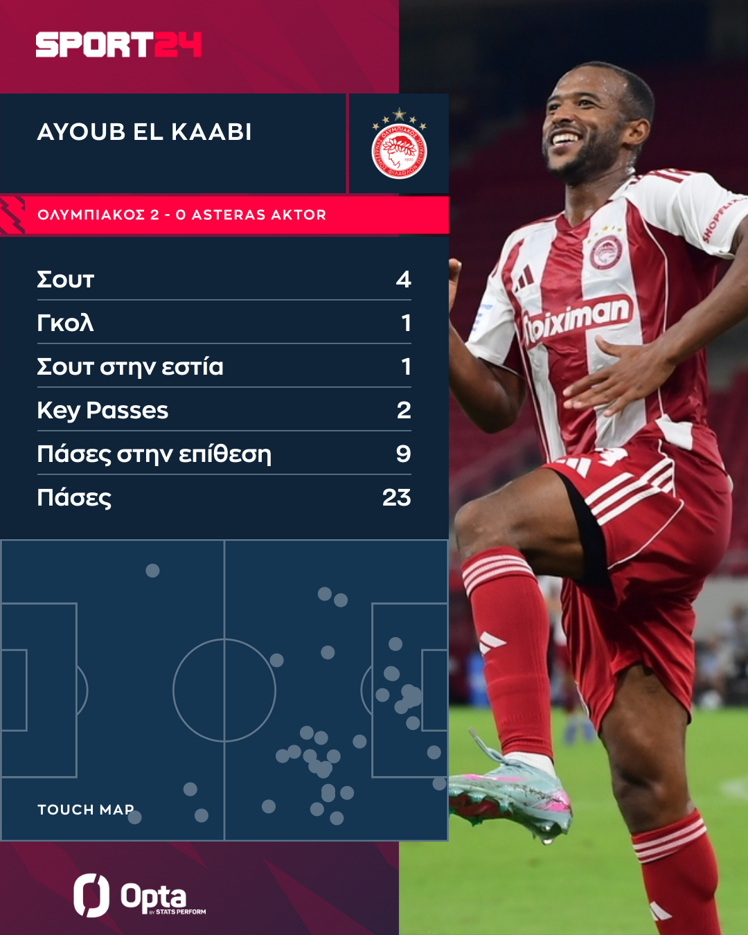 Ο Αγιούμπ Ελ Κααμπί σφράγισε τη νίκη του Ολυμπιακού επί του Αστέρα AKTOR με την πρώτη του τελική στην εστία, και την πρώτη του τελική με το πόδι, και έδειξε από νωρίς πόσο κομβικό ρόλο θα παίξει για τους ερυθρόλευκους και τη νέα σεζόν.