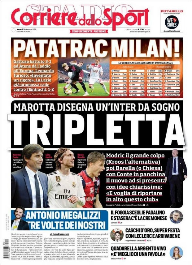 Η “Corriere dello Sport” από την πλευρά της αναφέρει με μεγάλα πράγματα: ” ΠΑΤΑΤΡΑΚ ΜΙΛΑΝ. Ο Γκατούζο έχασε με 3-1 στην Αθήνα και αποχαιρέτισε την Ευρώπη“, ενώ αναφορά γίνεται και στον Λεονάρντο που ξέσπασε κατά της διαιτησίας.