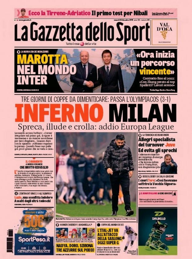 Το Sport24.gr σας παρουσιάζει πώς υποδέχθηκαν τρεις κορυφαίες ιταλικές εφημερίδες την ήττα της ομάδας του Τζενάρο Γκατούζο. Ας αρχίσουμε με την Gazzetta dello Sport η οποία στο βασικό της τίτλο γράφει: ” Κόλαση για τη Μίλαν που λέει αντίο στο Europa League.”