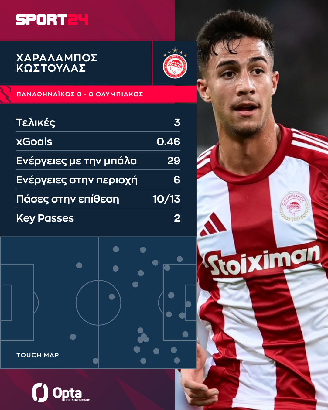 Στο γράφημα της Opta/Stats Perform μπορείτε να δείτε όλες τις ενέργειες και τις κορυφαίες επιδόσεις του Κωστούλα στο ντέρμπι απέναντι στον Παναθηναϊκό.
