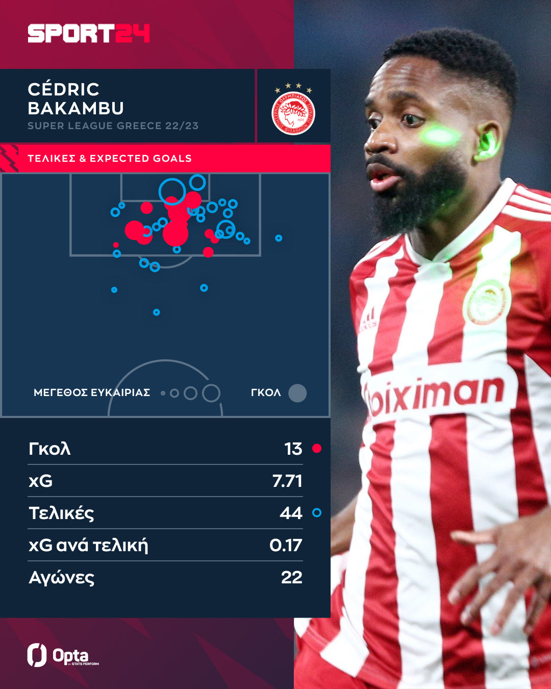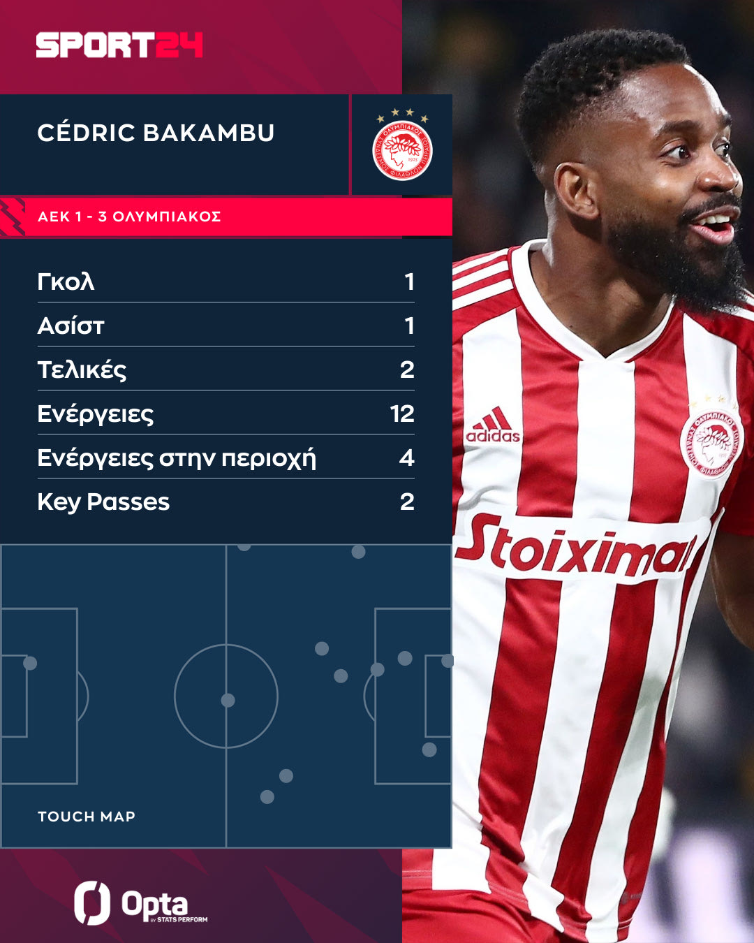 Ο Ολυμπιακός επικράτησε 3-1 της ΑΕΚ στην OPAP Arena, με τον Σεντρίκ Μπακαμπού να είναι σε δαιμονιώδη φόρμα πετυχαίνοντας ένα γκολ και μοιράζοντας μία ασίστ. Ο κεντρικός επιθετικός είναι το απόλυτο κανόνι των ερυθρόλευκων.