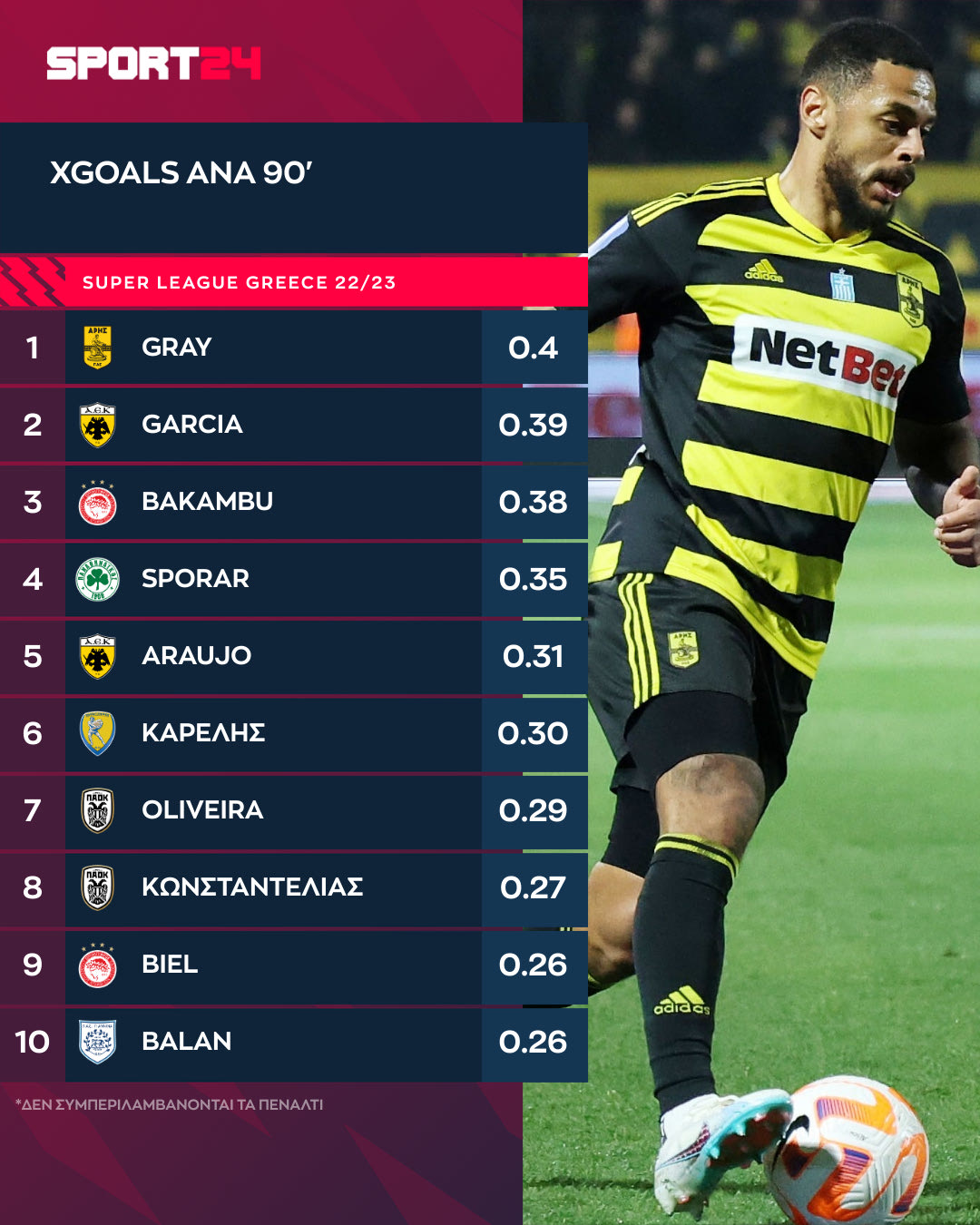 Ο Κονγκολέζος στράικερ έχει 0.38xGoals ανά 90λεπτο, χωρίς να υπολογίζουμε τα πέναλτι. Οριακά μπροστά του βρίσκονται μονάχα ο Άντρε Γκρέι του Άρη (0.40xG) και ο Λιβάι Γκαρσία (0.39) της ΑΕΚ. Αυτή είναι η τριάδα των πιο επικίνδυνων παικτών του πρωταθλήματος.