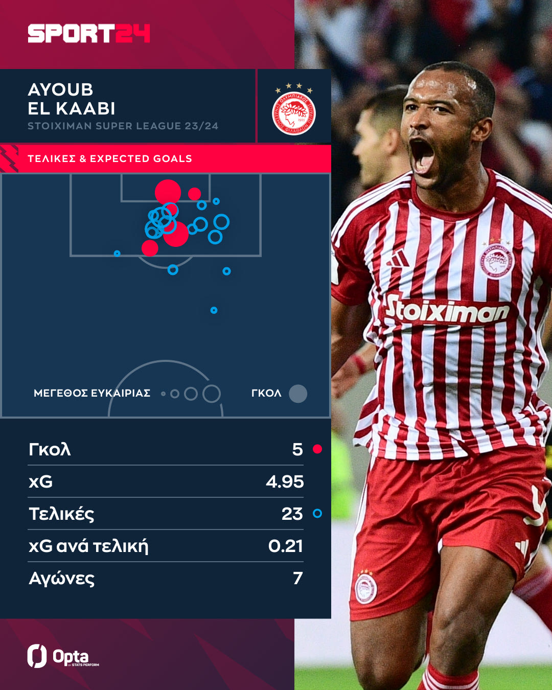 Ο Ελ Κααμπί έχει πετύχει πέντε γκολ τη φετινή σεζόν. Συνολικά έχει 23 τελικές, τις περισσότερες στο πρωτάθλημα στις επτά αγωνιστικές, με συνολική “αξία” 4.95xG.