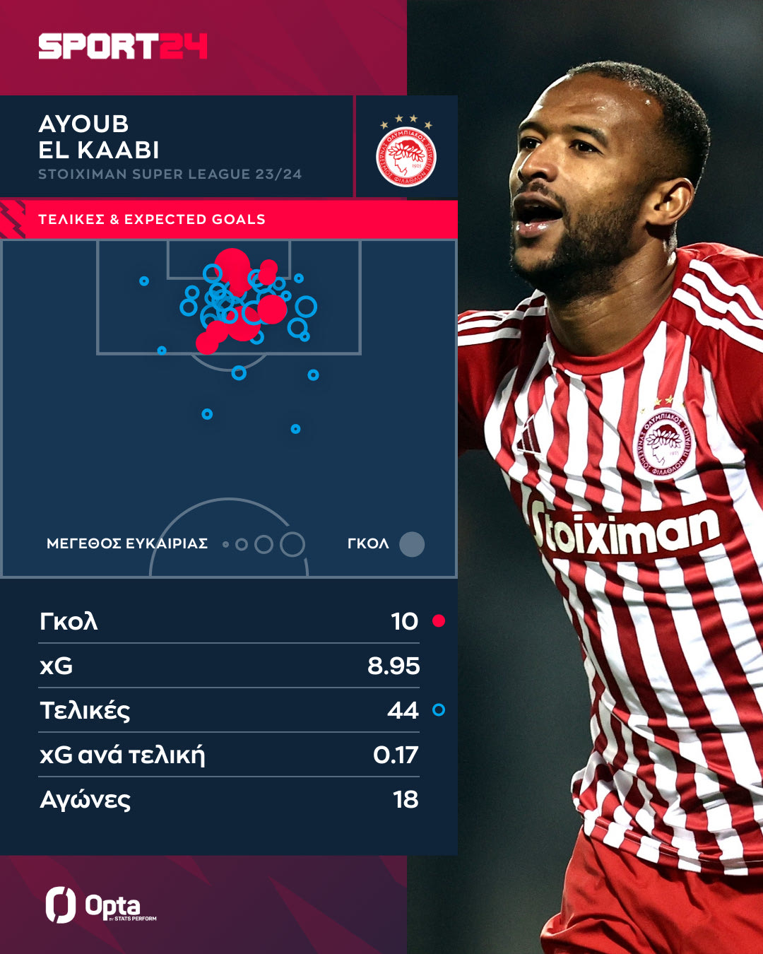 Στο γράφημα της Opta/Stats Perform μπορείτε να δείτε όλες τις τελικές και τα xGoals του Ελ Κααμπί στην Stoiximan Super League.