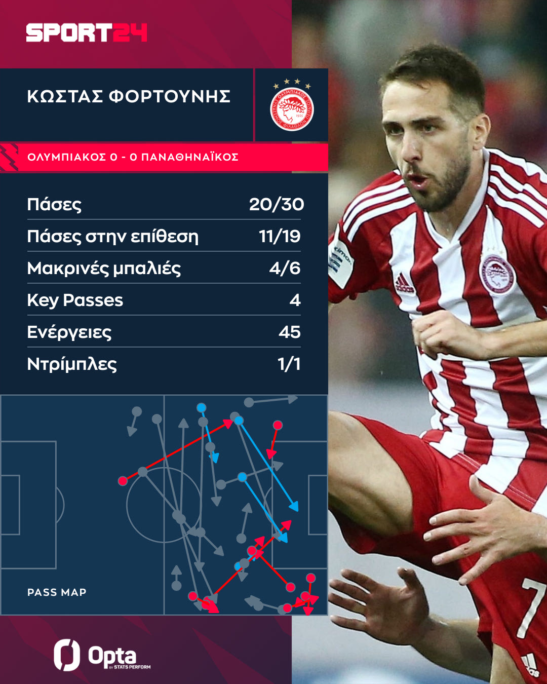 Ο Φορτούνης τελείωσε το παιχνίδι με τέσσερις key passes, δηλαδή πάσες που έφτιαξαν τελική. Ήταν η κορυφαία επίδοση στο ντέρμπι των αιωνίων και κορυφαία επίδοση για τον μεσοεπιθετικό των ερυθρόλευκων τη φετινή χρονιά. Οι μεταβιβάσεις του ήταν μόνιμος πονοκέφαλος για τον Παναθηναϊκό, καθώς “μύριζαν” και κίνδυνο.