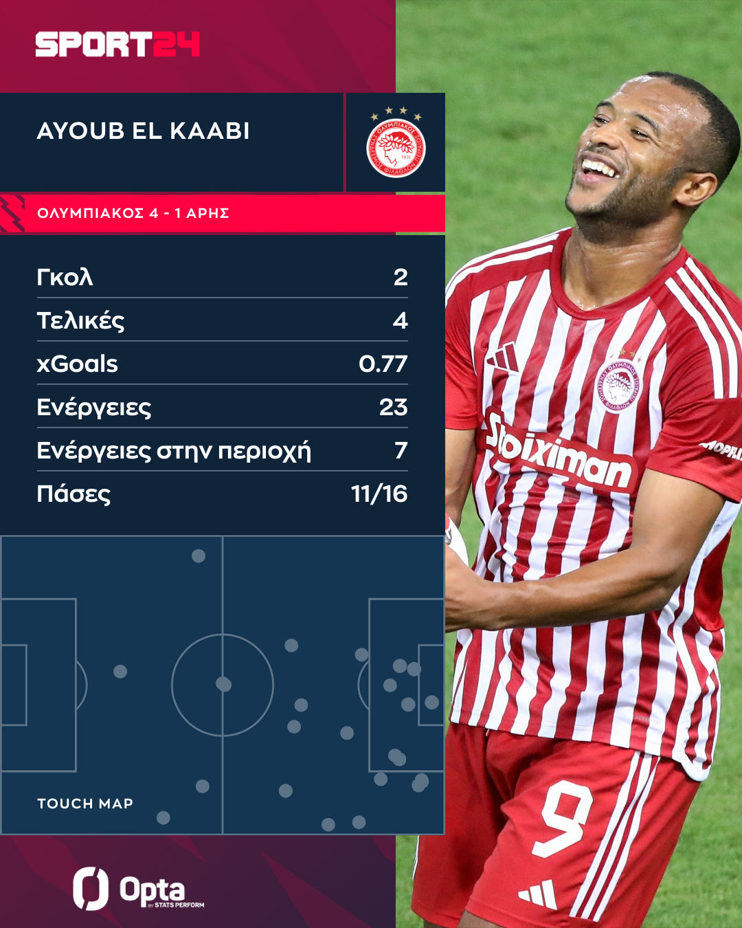 Ο Αγιούμπ Ελ Κααμπί πέτυχε δύο γκολ στην τεσσάρα του Ολυμπιακού επί του Άρη, έφτασε τα πέντε γκολ στη Stoiximan Super League και κάνει τους ερυθρόλευκους να ξεχάσουν τον Μπακαμπού.