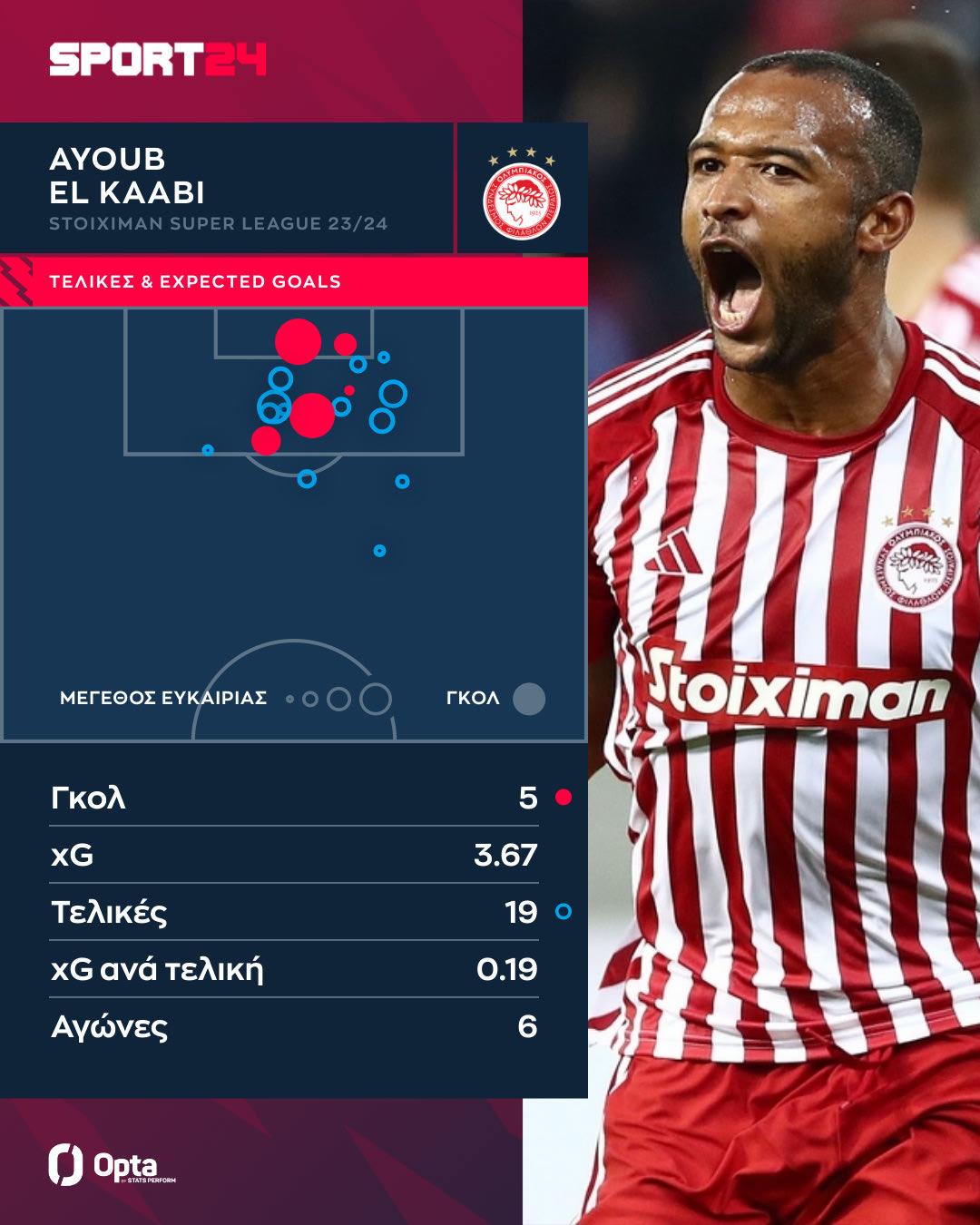 Στο γράφημα της Opta/Stats Perform μπορείτε να δείτε όλες τις τελικές, τα xGoals και τα γκολ του Ελ Κααμπί στη Stoiximan Super League.