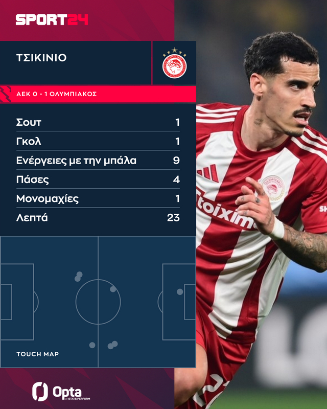 Ο Μεντιλίμπαρ έριξε στο χορτάρι τον Τσικίνιο στο 67ο λεπτό και εκείνος πρόλαβε να κάνει τη διαφορά χωρίς να χρειαστεί να κάνει πολλά, όπως φαίνεται στο γράφημα της Opta Stats / Perform.