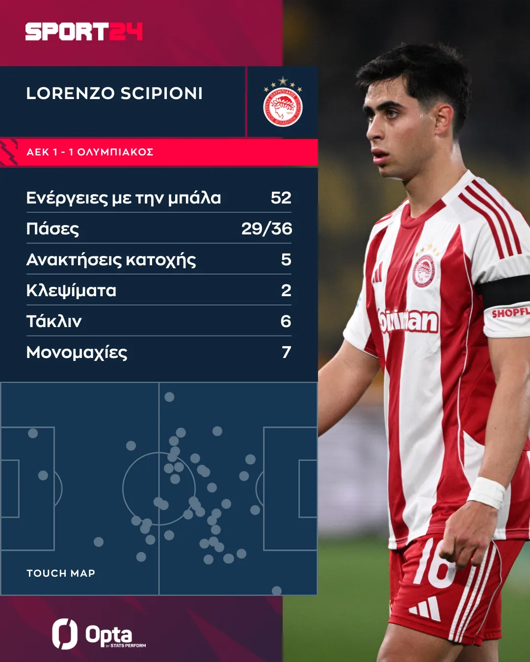 O Λορέντζο Σιπιόνι είχε συνολικά 52 ενέργειες με την μπάλα. Οι περισσότερες από αυτές ήταν μεταξύ της αντίπαλης περιοχής και της μεσαίας γραμμής. Ο Αργεντινός μέσος βοήθησε τον Ολυμπιακό να κυριαρχήσει στη μάχη του κέντρου στη μεσαία γραμμή.