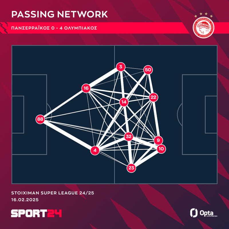 Όπως διαφαίνεται στο γράφημα της Opta Stats / Perform με το passing network των παικτών του Ολυμπιακού, ο Ζέλσον Μαρτίνς (με το Νο10) κινήθηκε ψηλότερα στο γήπεδο από κάθε άλλον ποδοσφαιριστή των “ερυθρόλευκων” και έψαχνε συνεχώς συνεργασίες με τον Ροντινέι και τον Ελ Κααμπί, αλλά και αργότερα με τον Γιάρεμτσουκ, με τον οποίο συνδυάστηκε για το τέταρτο γκολ των Πειραιωτών.