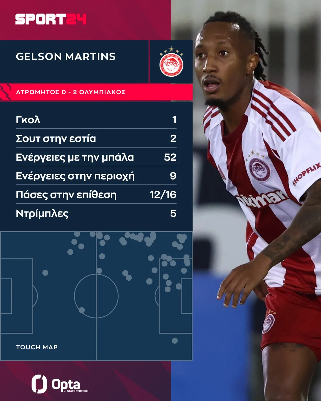 Στο παρακάτω γράφημα της Opta/Stats Perform, μπορείτε να δείτε όλες τις ενέργειες, αλλά και τις κορυφαίες επιδόσεις του Ζέλσον Μαρτίνς απέναντι στον Ατρόμητο.