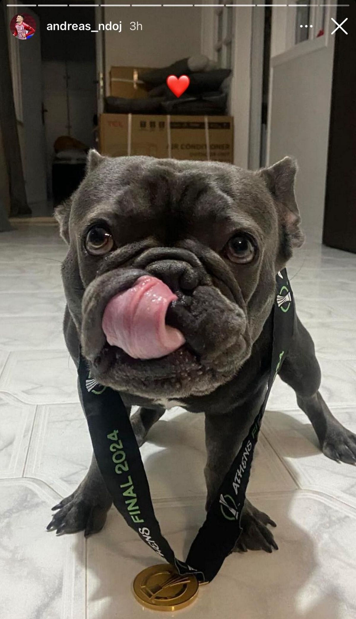 Ο Ντόη φόρεσε στον σκύλο του το μετάλλιο του Conference League Instagram / @andreas_ndoj