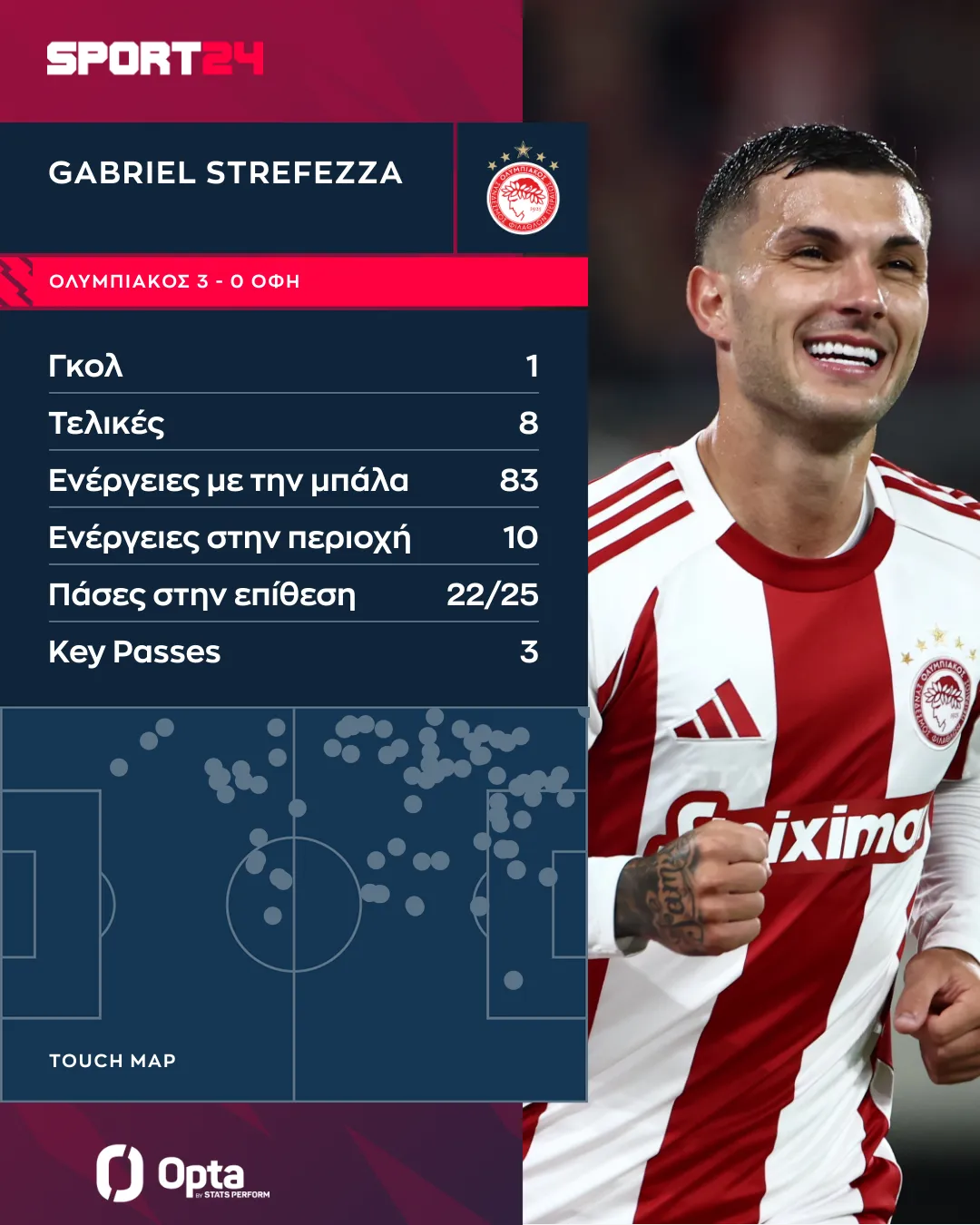 Ο Γκάμπριελ Στρεφέτσα πανηγύρισε το παρθενικό του γκολ με τη φανέλα του Ολυμπιακού και δείχνει πως βρίσκεται σε καλό δρόμο, για να πετύχει ακόμη περισσότερα. Αναλυτικά οι επιδόσεις του απέναντι στον ΟΦΗ.