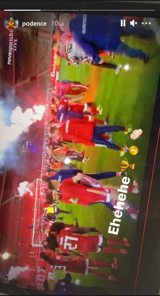 Έτσι, πανηγύρισε την κατάκτηση του τίτλου ανεβάζοντας σε Instagram story μία φωτογραφία της τηλεόρασής του, όπου βλέπει τους πανηγυρισμούς των παικτών του Ολυμπιακού για την κατάκτηση του πρωταθλήματος.