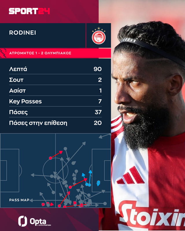 Η πολυδιάστατη παρουσία του Ροντινέι στο Περιστέρι όμως δεν περιορίστηκε στην ασίστ για το πρώτο γκολ του Ολυμπιακού. Ο 32χρονος φουλ-μπακ είχε 7 key passes, τουλάχιστον τέσσερις περισσότερες από κάθε άλλον ποδοσφαιριστή των “ερυθρόλευκων”.