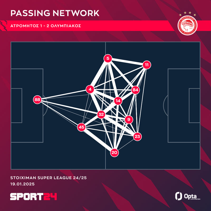Ο Βραζιλιάνος ξεκίνησε στο δεξί “φτερό” της επίθεσης των Πειραιωτών και κινήθηκε ψηλότερα από όλους τους συμπαίκτες του πλην του Βέλντε, όπως φαίνεται και στο γράφημα της Opta Stats / Perform με τη μέση θέση των ενεργειών των παικτών του Ολυμπιακού στο Περιστέρι.
