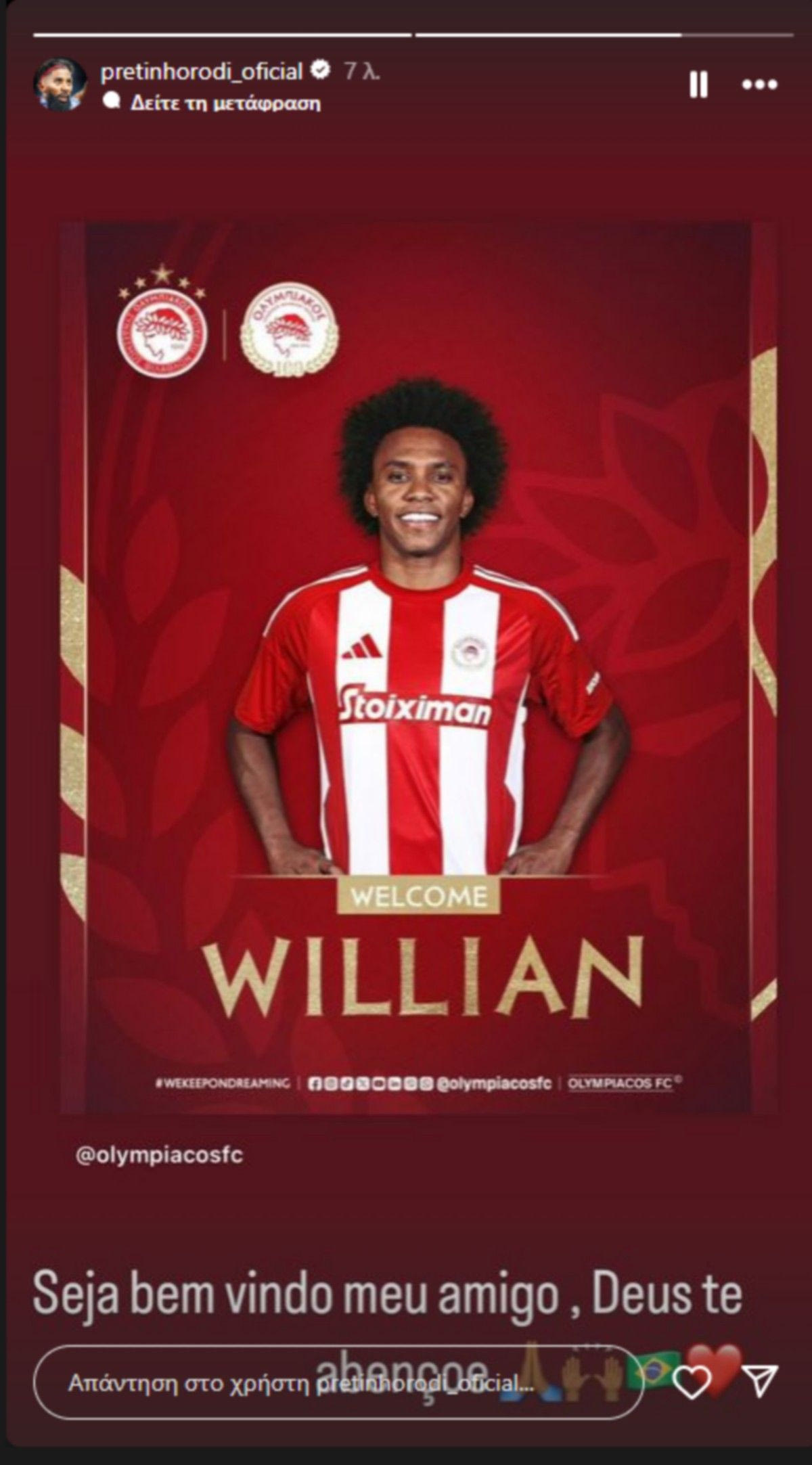 Ο Ροντινέι καλωσόρισε τον Γουίλιαν στον Ολυμπιακό μέσω μίας ανάρτησης στο Instagram.