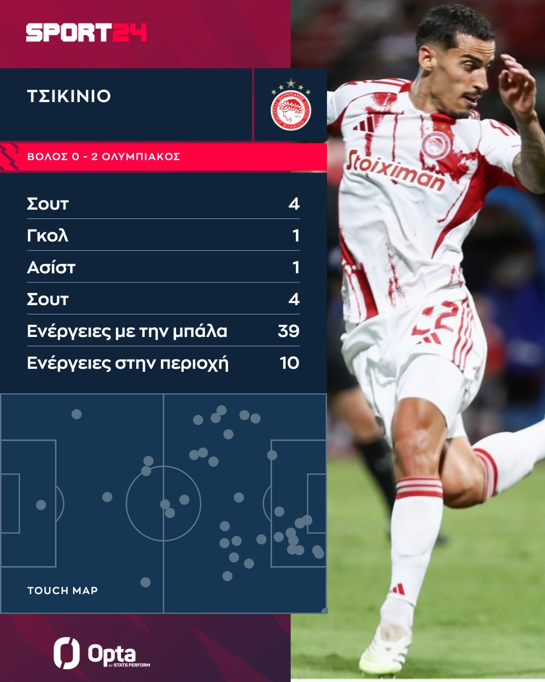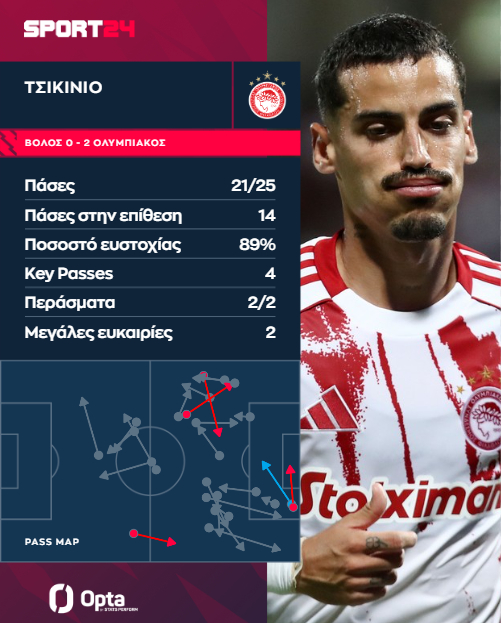 Παράλληλα, ο Τσικίνιο είχε 4 τελικές στο παιχνίδι, τις περισσότερες στο παιχνίδι, ενώ όλες ήρθαν μέσα από τη μεγάλη περιοχή του Βόλου. Από τις τέσσερις τελικές του Τσικίνιο προήλθαν σχεδόν 0,3 xG, ενώ αξίζει να σημειωθεί πως η τελική του Ρέτσου από την ασίστ του Πορτογάλου ήταν η καλύτερη στο παιχνίδι, καθώς “άξιζε” 0,8 xG.
