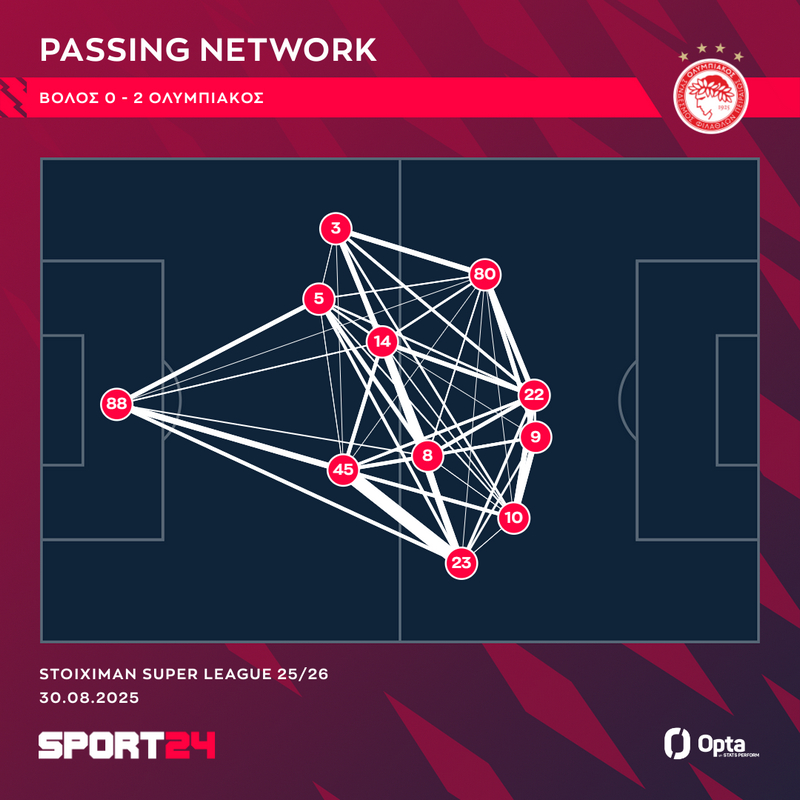 Ο γεννημένος στο Σάντο Τίρσο της Βόρειας Πορτογαλίας μεσοεπιθετικός είχε διαρκή συνεργασία τόσο με τον Μαροκινό φορ, όσο και με τους Πνευμονίδη, Γκαρθία και Νασιμέντο, όπως διαφαίνεται στο γράφημα της Opta / Stats Perform με το passing network των ποδοσφαιριστών του Ολυμπιακού στην αναμέτρηση του Πανθεσσαλικού.