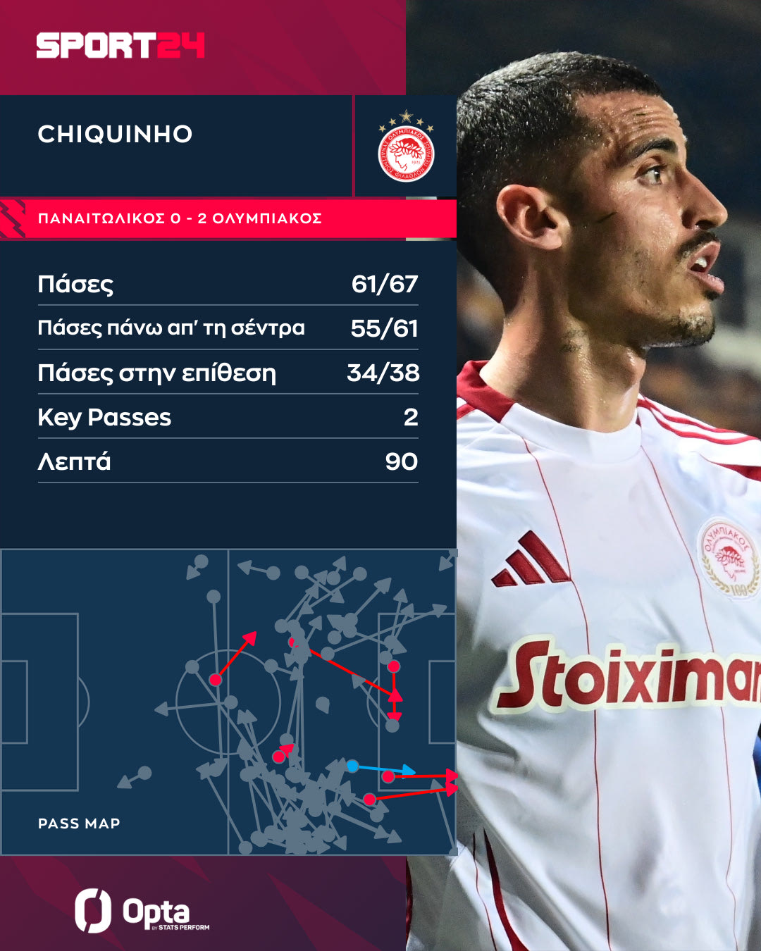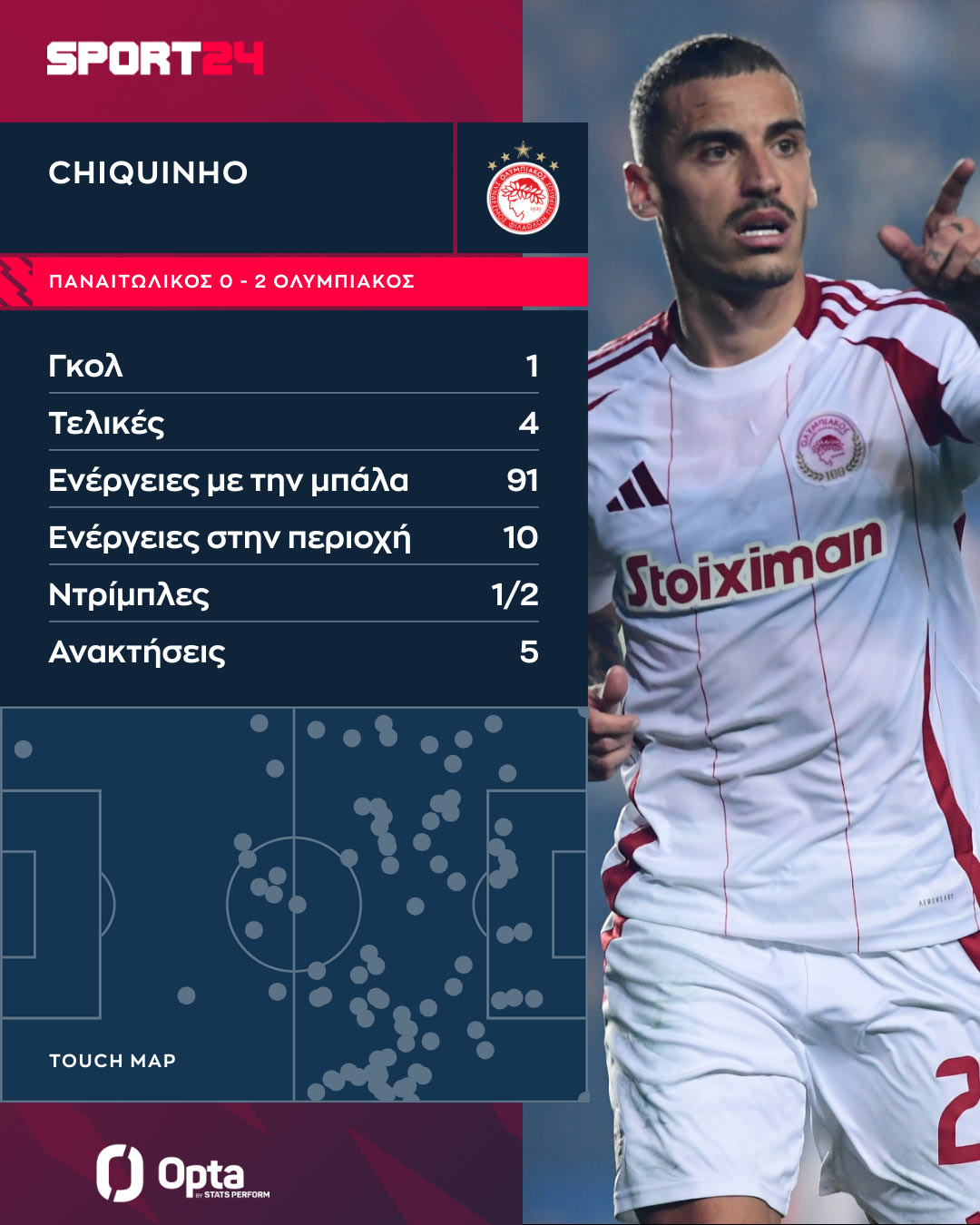 Ο Πορτογάλος μέσος ήταν, μάλιστα, και εκ των κορυφαίων εκτελεστών του Ολυμπιακού. Είχε τέσσερις τελικές, με τη μία να καταλήγει στα δίχτυα. Τα τρία από αυτά τα σουτ του ήταν μέσα από την περιοχή του Παναιτωλικού.