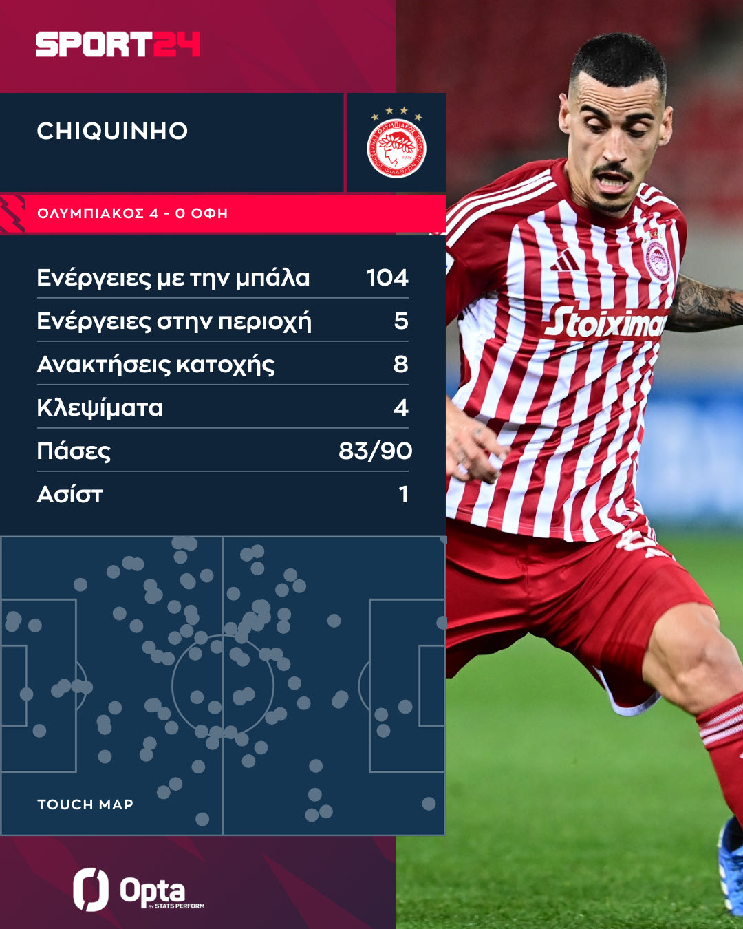 Τέσσερις διαφορετικούς σκόρερ είχε ο Ολυμπιακός απέναντι στον ΟΦΗ (Μασούρας, Ελ Κααμπί, Ποντένσε, Φορτούνης). Ωστόσο, εκ των πρωταγωνιστών της αναμέτρησης ήταν ο Τσικίνιο, που αγωνίστηκε για δεύτερη συνεχόμενη φορά ως βασικός, και έριξε πολλή δουλειά στο γήπεδο. Στο γράφημα της Opta/Stats Perform μπορείτε να δείτε τις ενέργειες του.
