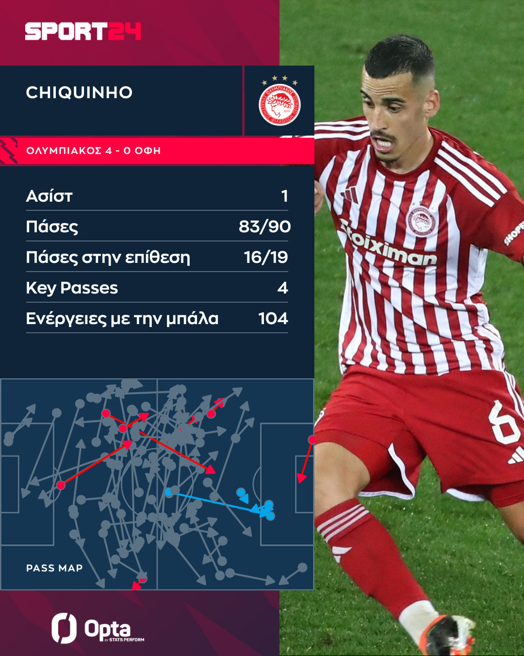 Επιπλέον, είχε 44/48 πάσες πάνω απ’ τη μεσαία γραμμή και 16/19 μεταβιβάσειος στην επίθεση. Έδειξε μεγάλη ακρίβεια και συνεχώς πούσαρε μπροστά το παιχνίδι των ερυθρόλευκων, επιχειρώντας να βρει ρήγματα στην άμυνα του ΟΦΗ.