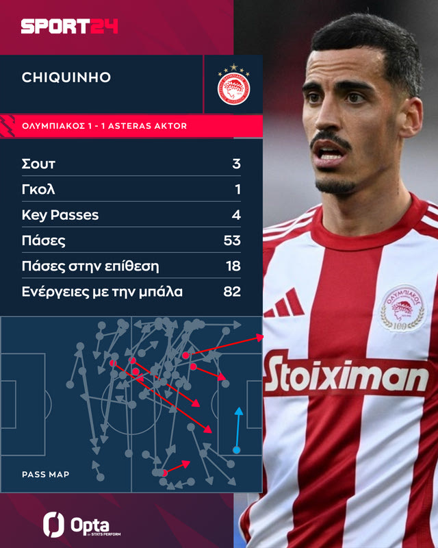 Ο Τσικίνιο είχε 82 ενέργειες με την μπάλα, τις περισσότερες από τους έξι ποδοσφαιριστές στα χαφ και στη γραμμή κρούσης του Ολυμπιακού, ενώ είχε και εξαιρετικό ποσοστό ευστοχίας στις μεταβοβάσεις του, με 47/53 (89%), όπως φαίνεται και στο γράφηματης Opta Stats / Perform με τις πάσες του 29χρονου.