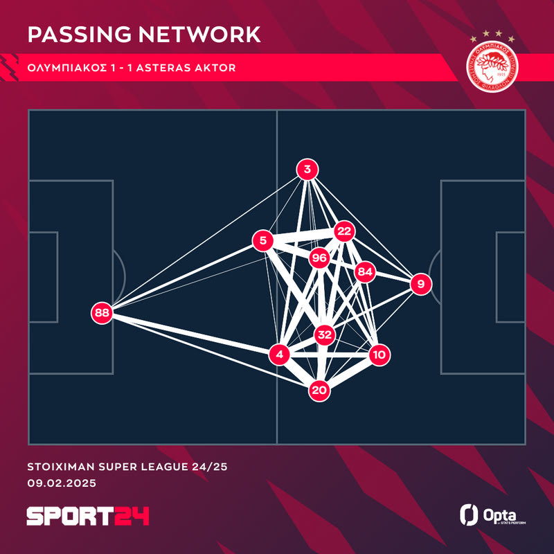 Από τις μεταβιβάσεις του αυτές, οι 18 ήταν στην επίθεση, ψάχνοντας συνεχώς τρόπους να διασπάσει το low block του Αστέρα Τρίπολης AKTOR, κάτι το οποίο πέτυχε σε μεγάλο βαθμό έχοντας 4 key passes, τις περισσότερες για τον Ολυμπιακό μαζί με τον Αγιούμπ Ελ Κααμπί.