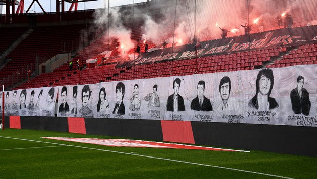 Το πανό στο "Γεώργιος Καραϊσκάκης" για τα θύματα της Θύρας 7 Eurokinissi