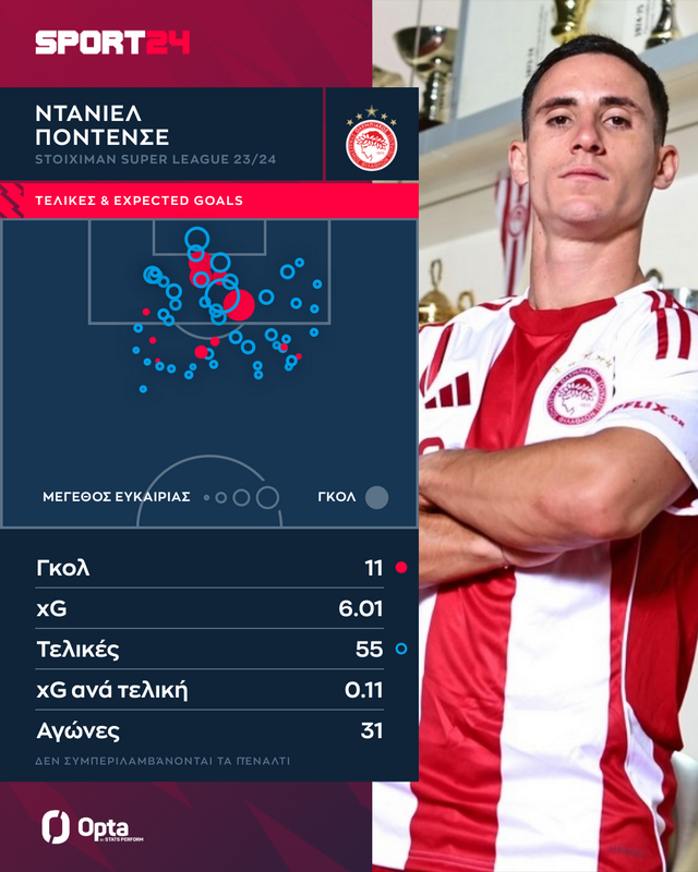 Οι αριθμοί της Opta / Stats Perform μάς επιτρέπουν να εμβαθύνουμε ακόμη περισσότερο στην προσφορά του Ντάνιελ Ποντένσε στο παιχνίδι του Ολυμπιακού.