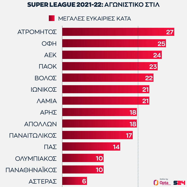 Ο Ολυμπιακός έχει 29 μεγάλες ευκαιρίες (μία λιγότερη από την ΑΕΚ), αλλά έχει δεχθεί μόλις 10. Κάπως έτσι, η σούμα λέει πως οι ερυθρόλευκοι έχουν στους αγώνες 19 περισσότερες μεγάλες ευκαιρίες από τους αντιπάλους τους.