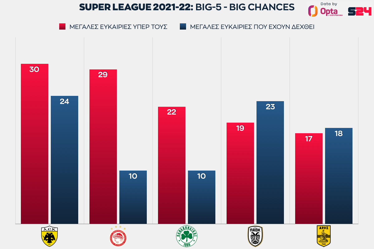 Κι αυτό κάνει όλη τη διαφορά όταν συγκριθεί με τις άλλες ομάδες του Big-5. Η ΑΕΚ έχει 30 μεγάλες ευκαιρίες, αλλά έχει δεχθεί 24(!), άρα έχει μόνο έξι περισσότερες.