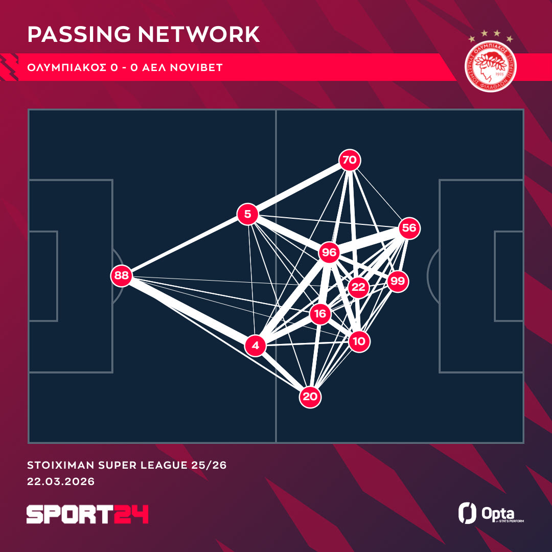 Ο Μουζακίτης (με τον αριθμό 96) βρέθηκε ακριβώς στο κέντρο όλων των ενεργειών της ομάδας του Πειραιά, όπως γίνεται πρόδηλο στο γράφημα της Opta / Stats Perform με το passing network των παικτών του Ολυμπιακού απέναντι στους βυσσινί.