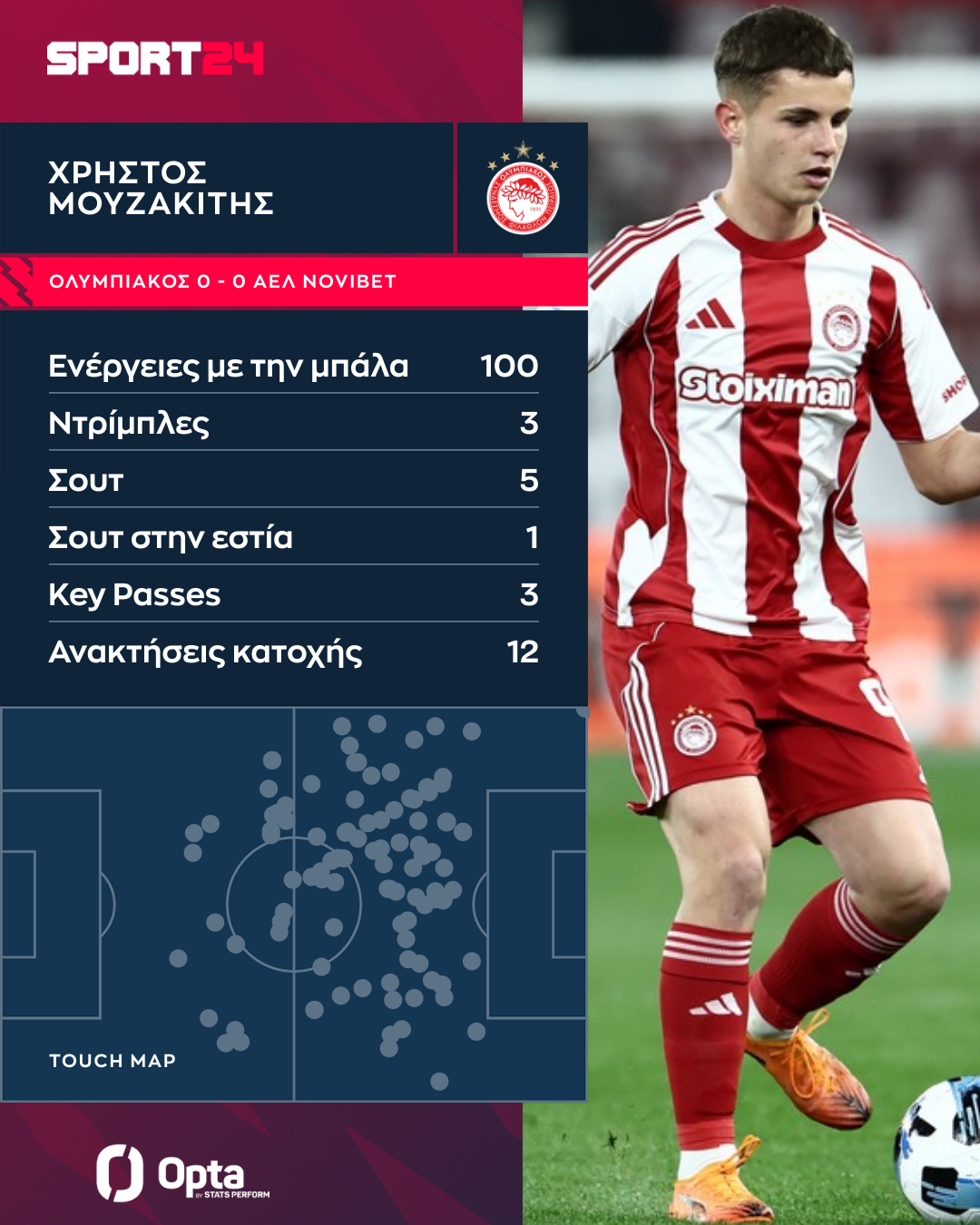 Οι ερυθρόλευκοι πήραν πολλά από τον νεαρό ανερχόμενο αστέρα, ο οποίος είχε 1 κάθετη μπαλιά (κανείς δεν είχε περισσότερες), ενώ δημιούργησε και τρεις στιγμές για τους συμπαίκτες του, κλείνοντας το ματς με 3 key passes.